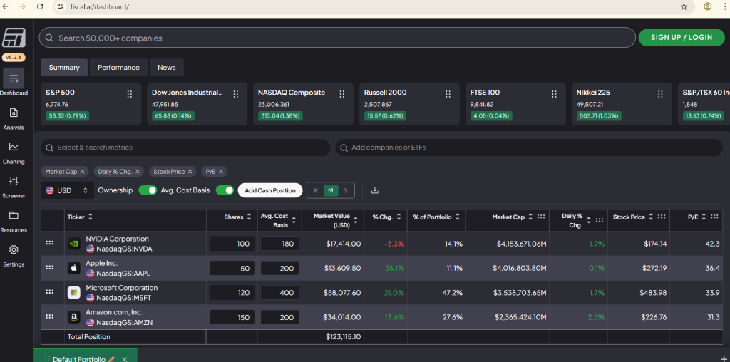 FinChat, now Fiscal.ai, ranks high for chat-style checks. Free tier gives 10 AI asks a month plus basic data. It pulls global stock facts, makes charts, and answers “Compare Tesla and Ford?”