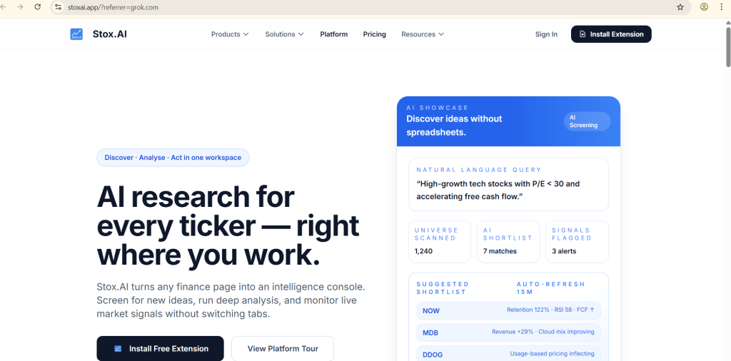Free plan: 20 screens, basic asks. From StoxAI site, works on Yahoo, Google.